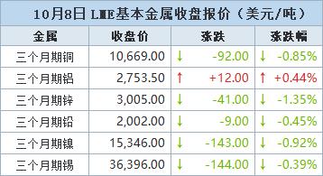 安托法加斯塔矿业(Antofagasta Minerals)位于智利的 Los Pelambres 铜矿工会领导人周二表示,工会拒绝 了一份新的合同提案,可能会导致罢工。这可能加剧供应担忧。 全球最大铜生产国智利8月产量同比下降9.9%,创两年多来最大降幅。 伦敦时间10月1日17:00(北京时间10月2日00:00),LME三个月期铜下跌145.5美元,或1.4%,收报每吨 10,268.5美元。稍早高见10,399美元,接近9月25日触及的15个月高位10,485美元。 | | 10月1日 LME基本金属收盘报价(美元/吨) | | | --- | --- | --- | | 全屋 | 收盘价 | 张跌 张跌幅 | | 三个月期铜 | 10.379.00 ↑ | +110.50 ↑ +1.08% | | 三个月期铝 | 2,688.50 1 | +8.00 ↑ +0.30% | | 三个月期锌 | 2,987.60 1 | +27.60 ↑ +0.93% | | 三个月期铅 | 2,010.50 ↑ | +22.00 ↑ +1.11% | | 三个月期镇 | 15,184.00 ↓ | -51.00 -0 ...