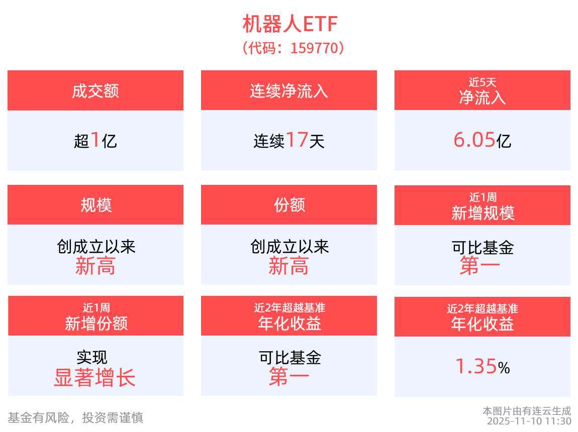 截至2025年11月10日午间收盘,机器人ETF(159770)成交1.83亿元。跟踪指数成分股方面涨跌互现,亿嘉和(603666)领涨5.04%,瑞松科技(688090)上涨 5.01%,华东数控(002248)上涨3.40%。 值得一提的是,机器人ETF(159770)获资金逆市加仓,截至午间收盘,该基金半日净申购8550万份。 | | 机器人ETF 159770 | ਐ | | --- | --- | --- | | | 通 融 ノ ○ + | | | 实时申购赎回信息 | 申购 | 赎回 | | 笔数 | ਟ 1 | 2 | | 金额 | O | 0 | | 份额 | 8850万 | 300万 | 截至11月7日,机器人ETF(159770)最新规模达98.54亿元,最新份额达95.41亿份,创成立以来新高。 从资金净流入方面来看,机器人ETF(159770)上周五最新单日获得2.85亿元净流入,居同类第一!近17天获得连续资金净流入,合计"吸金"14.74亿元。 【产品亮点】 1、京东狼族机器人全球智能工厂项目签约落地 近日,京东狼族机器人全球智能工厂项目正式签约落地无锡,将建设全球首个智能物流机器 ...