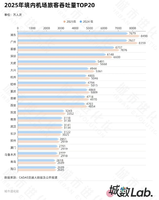 每经记者|程晓玲 每经编辑|杨欢 截至2025年,我国航空总人口超5亿,成为全球第一航空人口大国。同期,全国多座机场客流量创下历史新高。CADAS交通大数据显示,2025年我国境内旅 客吞吐量超1000万人次的机场已达到41座,其中揭阳潮汕机场是首次跻身千万级机场行列。 图片来源:摄图网_500134954_ 随着揭阳潮汕机场"入列",广东成为全国首个拥有四个千万级机场的省份。过去一年,广东机场群高光不断——2025年,上海浦东、广州白云机场旅客吞吐 量先后突破8000万人次大关,在全国200余座机场中遥遥领先。从全年旅客吞吐量看,排名第二的白云机场与浦东机场仅相差100多万人次,差距甚微。 | 0 | 0.5 | 1 | 1.5 | 2 | 2 | | --- | --- | --- | --- | --- | --- | | 广东 | | | 1 | | | | 浙江 | | | | | | | 辽宁 | | | | 2 | | | 海南 | | | | 2 | | | 山东 | | | | 2 | | | 福建 | | | | 2 | | | 江苏 | | | | 2 | | | 四川 | | | | ...