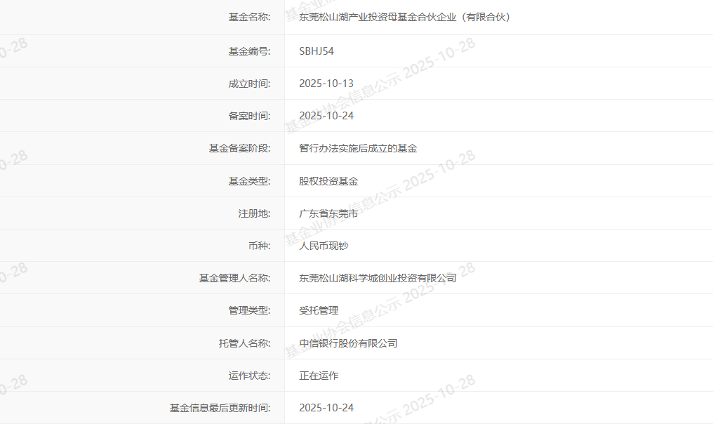 东莞松山湖百亿产投母基金完成备案