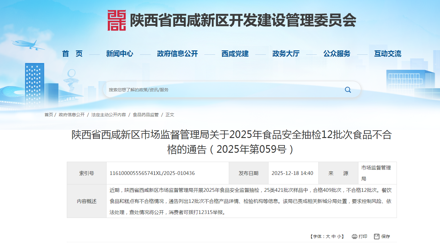 陕西省西咸新区市场监督管理局关于2025年食品安全抽检12批次食品不合格的通告(2025年第059号)
