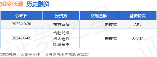 证券之星消息,根据天眼查APP于10月30日公布的信息整理,合肥知冷低温科技有限公司A轮融资,融 资额未披露,参与投资的机构包括东方富海。 合肥知冷低温科技有限公司,依托于安徽大学AHU-DR400科技成果而成立,该项目基于低温科学研究 及工程应用对于无液氦、极低温、大冷量、大空间、高稳定性的需求,突破了大冷量干式极低温稀释制 冷技术,所研制极低温稀释制冷机的低温8.5mK,冷量达到550uW@100mK,冷板直径300mm@10mK,可满 足相关科学研究及工程应用对于极低温设备的需求,产品基本参数达到国际先进水平。 数据来源:天眼查APP 以上内容为证券之星据公开信息整理,由AI算法生成(网信算备310104345710301240019号),不构成 投资建议。 | 公布日 | 投资方 | 交易金额 | 融资轮次 | | --- | --- | --- | --- | | 2025-10-30 | 东方富海 | 未披露 | A轮 | | 2024-03-05 | 合肥高投 科大硅谷 | 未披露 | 天使轮 | | | 国耀资本 | | | ...