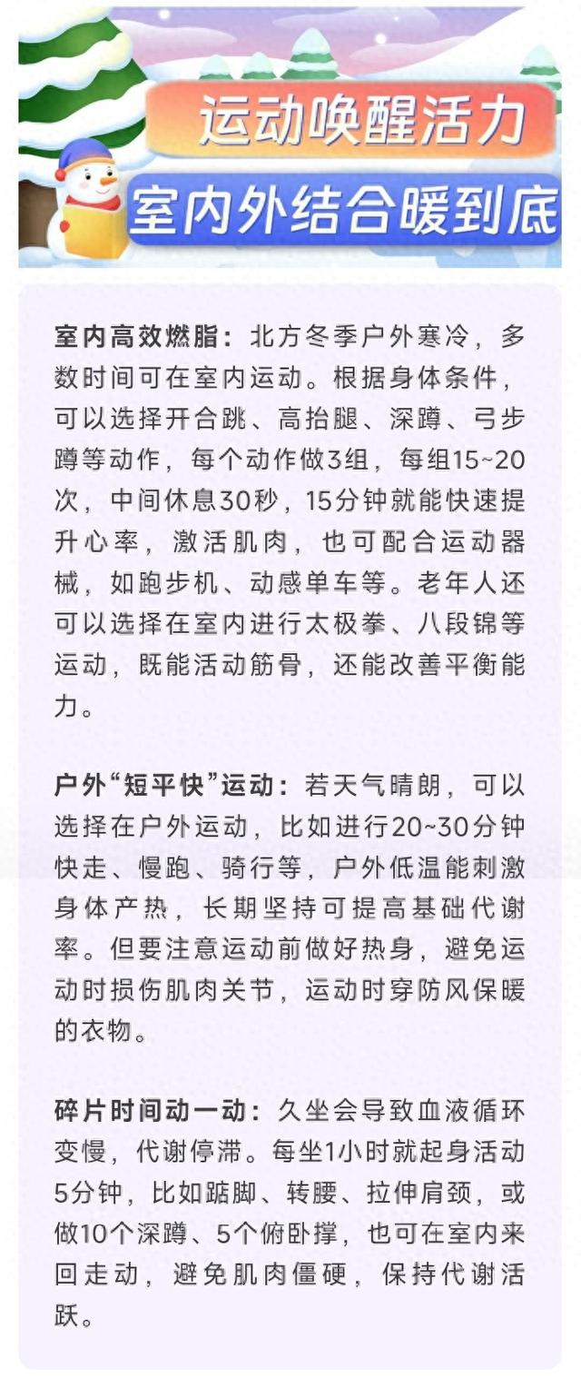 高蛋白及温热饮食,双重抗寒燃脂:每天保证摄入"手掌心大小"的优质蛋白(如羊肉、牛肉、鱼虾、鸡 蛋、豆腐等)。蛋白质消化时消耗的热量是碳水化合物的2倍,还能增强饱腹感。搭配温热主食,既能 暖身又能减少肠胃负担,让代谢高效运转。 冬季人体为了抵御严寒会自动进入"节能模式"。此外,外面天气寒冷,人们更愿意在暖气房久坐,增加 高热量食物的摄入,"贴冬膘"几乎成了常态。那在寒冷的冬天,我们该如何提高代谢率呢?在饮食上建 议: 及时补充水分,加速身体代谢:北方暖气房非常干燥,身体水分流失快,缺水会直接导致代谢变慢。每 天喝够1500~2000毫升温水,还可在水中加生姜片、红枣或枸杞等,暖身又补水。避免用奶茶、含糖饮 料替代温水,也不要等渴了再喝,每隔1小时主动喝1次。 冬季进补要适度:北方有冬季进补的习俗,应以"温和滋补"为主,避免大量吃高脂肪、高热量的补品, 否则会导致脂肪堆积,加重身体负担。 巫切,既能洁动肋骨,处能以善半倒能 力。 转自:北京日报客户端 及时补充水分,加速身体代谢:北方暖 气房非常干燥,身体水分流失快,缺水 会 直 接 导 致 代 谢 变 慢 。 每 天 喝 够 1500~2000毫升温水,还可在水 ...