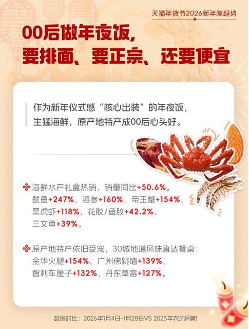 天猫年货节2026新年味趋势 00后对"正宗"的追求,关键落在了"产地"上。为更好满足年轻消费者的需求,天猫年货节推出 "寻味山 河行"计划,联动全国30个城市,让年味从产地直达餐桌,地域特色风味热销。广州佛跳墙增长139%、 金华火腿增长154%、智利车厘子增长132%、丹东草莓增长127%。 天猫年货节数据显示,00后正在接过置办年货的大权,把"过年办货"变成"生活态度"。 天猫年货节发布2026新年味趋势,00后用户成为年味消费增长最快的驱动力之一,整体成交占比超3 成,下单金额同比去年年货节增长47%。他们凭借"既要又要"的消费哲学重塑年味趋势:做饭既要排面 也要正宗,过年既要放肆又要回血,送礼既要悦己还要社交。 做饭既要又要还要,要排面、要正宗、还要便宜 作为新年仪式感"核心出装"的年夜饭,不仅要排面还要正宗。 1月4日,天猫年货节开卖,截至1月28日,海鲜水产礼盒销量同比增长50.6%,海鲜作为年夜饭的排面 担当,各类单品几乎"全员上涨"。海参同比去年农历同期增长160%、帝王蟹增长154%、黑虎虾增长 118%、鱼胶增长42%、三文鱼增长39%。与此同时,作为省时利器的家宴礼盒下单同比激增375 ...