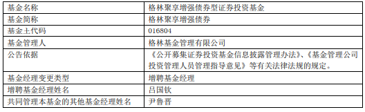 中国经济网北京12月31日讯 今日,格林基金公告,格林聚合增强债券、格林聚享增强债券、格林 聚利增强一个月持有期债券增聘吕国钦。 吕国钦曾任海影(上海)投资咨询有限公司投资研究部量化研究员、宁波平方和投资管理合伙企业 (有限合伙)投资研究部量化策略研究员、上海启林投资管理有限公司投资研究部资深量化研究员、东 兴基金管理有限公司量化投资部量化研究员。2025年12月加入格林基金,曾任固定收益部基金经理助 理,现任基金经理。 格林聚利增强一个月持有期债券A/C成立于2024年9月19日,截至2025年12月30日,其今年来收益 率为4.33%、3.76%,成立来收益率为5.63%、4.74%,累计净值为1.0563元、1.0474元。 | 基金名称 | 格林聚享增强债券型证券投资基金 | | --- | --- | | 基金简称 | 格林聚享增强债券 | | 基金土代码 | 016804 | | 基金管理人 | 格林基金管理有限公司 | | 公告依据 | 《公开募集证券投资基金信息披露管理办法》、《基金管理公司 | | | 投资管理人员管理指导意见》等有关法律法规的规定。 | | 基金经理变更类型 | 增聘其金经 ...