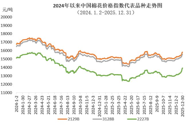 (来源:锦桥纺织网) 来源:锦桥纺织网 项目承担:北京棉花展望信息咨询有限责任公司 监测对象:18个主要棉花生产、消费省的100家棉纺织厂 2025年国内棉价震荡运行,总体呈现"先稳后跌、再涨回升"的波动走势。受美国加征关税政策冲击,中 国棉花价格指数年内最低跌至14100元/吨,但在国内促消费政策、中美经贸磋商进展等因素影响下年中 最高涨至15609元/吨,下半年新疆棉花产量再创新高,对棉价上涨有所抑制,但在宏观环境改善的推动 下年底仍回升至15500元/吨以上的年度相对高位。中国棉花价格指数全年均价14903元/吨,同比下跌 6.7%。 12月国内棉价延续11月底涨势,在宏观政策利好、纺织市场淡季不淡合力推动下震荡走高;国际棉价受 美棉出口疲软、库存增加、美元走弱等因素影响先跌后反弹,均价环比下跌。内外棉价走势分化,价差 持续扩大。 一、宏观环境向好 提振棉价上涨 尽管新棉大量上市,市场供给相对充裕,但纺织需求受元旦节日假期支撑,加上中央经济工作会议召 开,明确明年将实施更加积极的财政政策和适度宽松的货币政策,把扩内需放在首位,有效提振市场信 心,推动国内棉价持续反弹,中国棉花价格指数月底收于最高点155 ...
