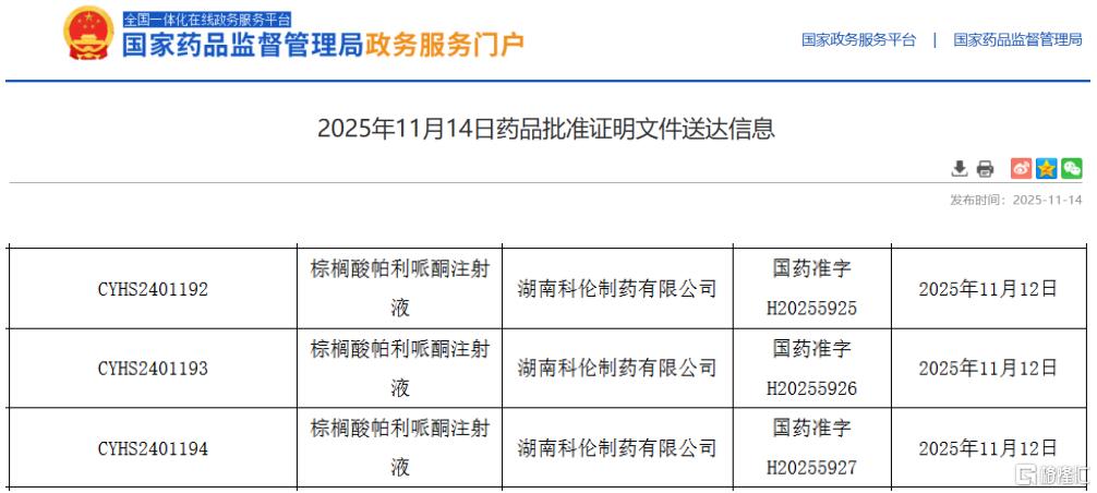 | CYHS2401192 | 棕榈酸帕利哌酮注射 | 湖南科伦制药有限公司 | 国药准字 | 2025年11月12日 | | --- | --- | --- | --- | --- | | | 液 | | H20255925 | | | CYHS2401193 | 棕榈酸帕利哌酮注射 | 湖南科伦制药有限公司 | 国药准字 | 2025年11月12日 | | | 液 | | H20255926 | | | CYHS2401194 | 棕櫚酸帕利哌酮注射 | 湖南科伦制药有限公司 | 国药准字 | 2025年11月12日 | | | 液 | | H20255927 | 目開發 | 截图来源:NMPA 棕榈酸帕利哌酮注射液作为第二代抗精神病药的代表,以帕利哌酮前体形式经肌肉注射后形成长效药物储库,持续缓释并转化为活性成分,通过精准拮抗多 巴胺D2受体与5-羟色胺2A(5-HT2A)受体,实现症状的稳定控制。 11月14日,据NMPA官网显示,湖南科伦制药提交的4类注册仿制药棕榈酸帕利哌酮注射液获批上市并视同通过一致性评价。今年以来,科伦药业(含子公 司)已经拿下6款首仿。 其独特的每月一次给药方案显著降低患者住 ...
