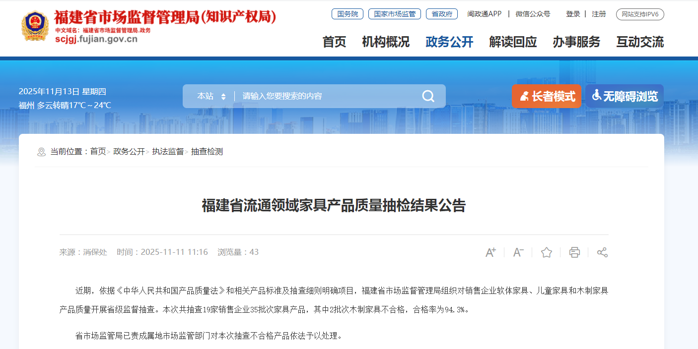中国质量新闻网讯 近日,福建省流通领域家具产品质量抽检结果公布。 附原文: 福建省流通领域家具产品质量抽检结果公告 1.查看弹簧软床垫是否具有产品标识和产品说明,产品标识是否注明生产商和生产地址,是否有检验合格证明和执行标准编号,查看产品使用说明是否列明 了主要原、辅材料名称和甲醛释放限量指标等。 近期,依据《中华人民共和国产品质量法》和相关产品标准及抽查细则明确项目,福建省市场监督管理局组织对销售企业软体家具、儿童家具和木制家具产 品质量开展省级监督抽查。本次共抽查19家销售企业35批次家具产品,其中2批次木制家具不合格,合格率为94.3%。 省市场监管局已责成属地市场监管部门对本次抽查不合格产品依法予以处理。 福建省家具产品质量省级监督抽查结果(合格) | | | | | | 生产 | 抽 查 | 不合格 | | | --- | --- | --- | --- | --- | --- | --- | --- | --- | | 受检企业名称 | 标称生产企业名称 | 产品名称 | 规格型号 | 商标 | 日期/ | | 项目 | 承检机构 | | | | | | | 批号 | 结 | | | | | | ...
