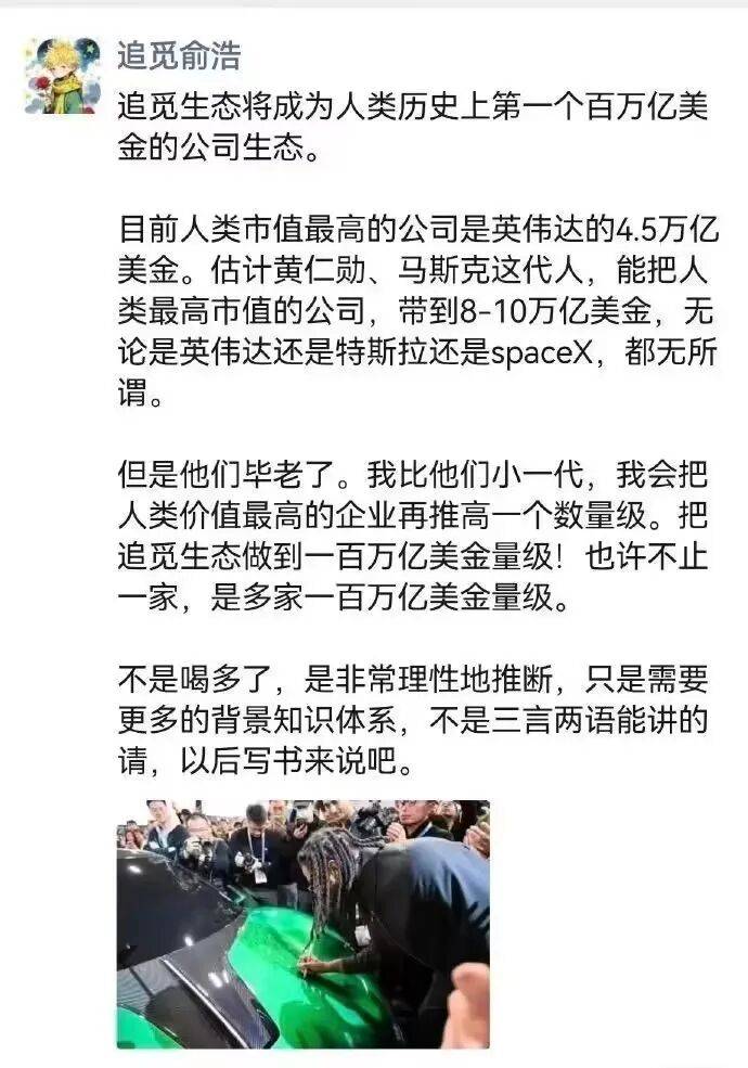 最热的泛财经新闻,都在这儿了。 wumiancaijing.com 重要提醒!!!为防失联,请"星标"我们!进入无冕财经公众号,点击右上角"...",再"",以便您及时接收每篇推送~ 本文由无冕财经(wumiancaijing)整理发布 资讯整理:海棠葉 编辑:程程 设计:岚昇 追觅CEO称打造首个百万亿美金生态 2025年营收预计超300亿 1月12日据鞭牛士报道,追觅科技创始人兼CEO俞浩发朋友圈表示,追觅生态将成为人类历史上第一个百万亿美金的公司生态。 俞浩提到,目前人类市值最高的公司是英伟达的4.5万亿美金。他预测,黄仁勋、马斯克这代企业家,能把人类最高市值的公司带到8-10万亿美金,无论 是英伟达还是特斯拉还是spaceX,都无所谓。 同时他表示,自己比这一代企业家年轻,将把人类价值最高的企业再推高一个数量级。把追觅生态做到一百万亿美金量级。也许不止一家,是多家一百万 亿美金量级。 ▲俞浩发朋友圈,图源鞭牛士 / 俞浩强调,这一推断非常理性,不是喝多了,具体逻辑以后写书来说。 俞浩还称: 追觅应该人人财务自由!!!我的朋友们应该人人财务自由!!! 综合IT之家此前报道,智能家居品牌追觅近期在各个领域 ...