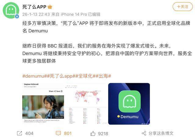 转自:扬子晚报 1月13日,死了么APP发布消息: 1月8日,苹果应用商店一款名为"死了么"的App受到关注。截至发稿时,该款App在苹果付费软件排行 榜位列第一。 据介绍,该应用是为独居人群打造的轻量化安全工具,用户需要设置紧急联系人并签到,若连续多日没 在应用内签到,系统将于次日自动发送邮件告知紧急联系人。 随后,记者购买下载该软件后,发现该软件界面较为简洁。中间有一个"签到"按钮,并提醒"2日未签 到,系统将以用户的名义,在次日邮件通知用户的紧急联系人"。 经团队审慎决策,"死了么"APP将于即将发布的新版本中,正式启用全球化品牌名Demumu。继昨日获 得BBC报道后,我们的服务在海外实现了爆发式增长。未来,Demumu将继续秉持安全守护的初心,把 源自中国的守护方案带向世界,服务全球更多独居群体。 . . �日签到 1 2 日未签到,系统将以你的名义,在 次日邮件通知你的紧急联系人 签到即同意 隐私政策 和 用户协议 头景 @扬子晚报 1月10日,记者采访到该App的创始开发团队成员之一吕先生。据吕先生介绍,团队内只有三人,都 是"95后",大家平时都有自己的工作,通过远程方式进行协作。 为什么要开 ...
