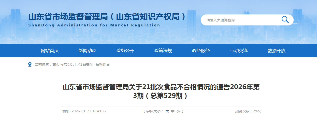 山东省市场监督管理局关于21批次食品不合格情况的通告(2026年第3期)