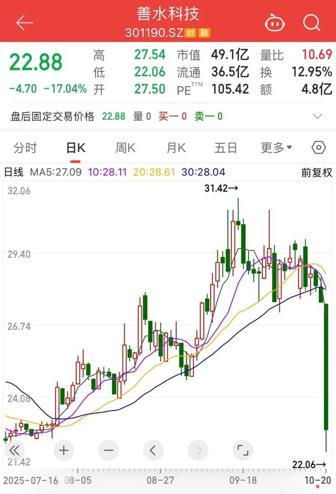 10月20日盘后,善水科技(301190.SZ)发布公告,公司于10月19日收到实际控制人、董事长兼总经理 黄国荣家属的通知,黄国荣因个人原因被采取刑事强制措施。 公告显示,善水科技于10月20日紧急召开第三届董事会第十七次会议,除公司董事长黄国荣未能出席, 其他与会董事一致同意由董事吴新艳代为履行公司董事长及法定代表人职责,以及代为履行公司董事会 相关委员会成员及总经理的职责。 值得注意的是,尽管善水科技选择在收盘后才公告这一重大利空消息,但资本市场似乎有所预兆。10月 20日当天,善水科技股价低开低走,盘中一度触及跌停。截至收盘,公司股价放量大跌17.04%,报 22.88元/股。 有投资者在社交平台质疑"消息提前泄露"。此外,疑似有投资者已提前知晓黄国荣被采取刑事强制措施 一事。针对信披合规一事,21财经·南财快讯记者多次拨打公司证券部电话,截至发稿仍无人接听。 公开资料显示,善水科技成立于2012年,主要经营染料中间体、农药和医药中间体的研发、生产和销售 业务,旗下2,3-二氯吡啶是明星专利杀虫剂产品氯虫苯甲酰胺(又名康宽)的核心原材料。2021年, 公司登陆创业板。 黄国荣则出生于1976年9月,曾 ...