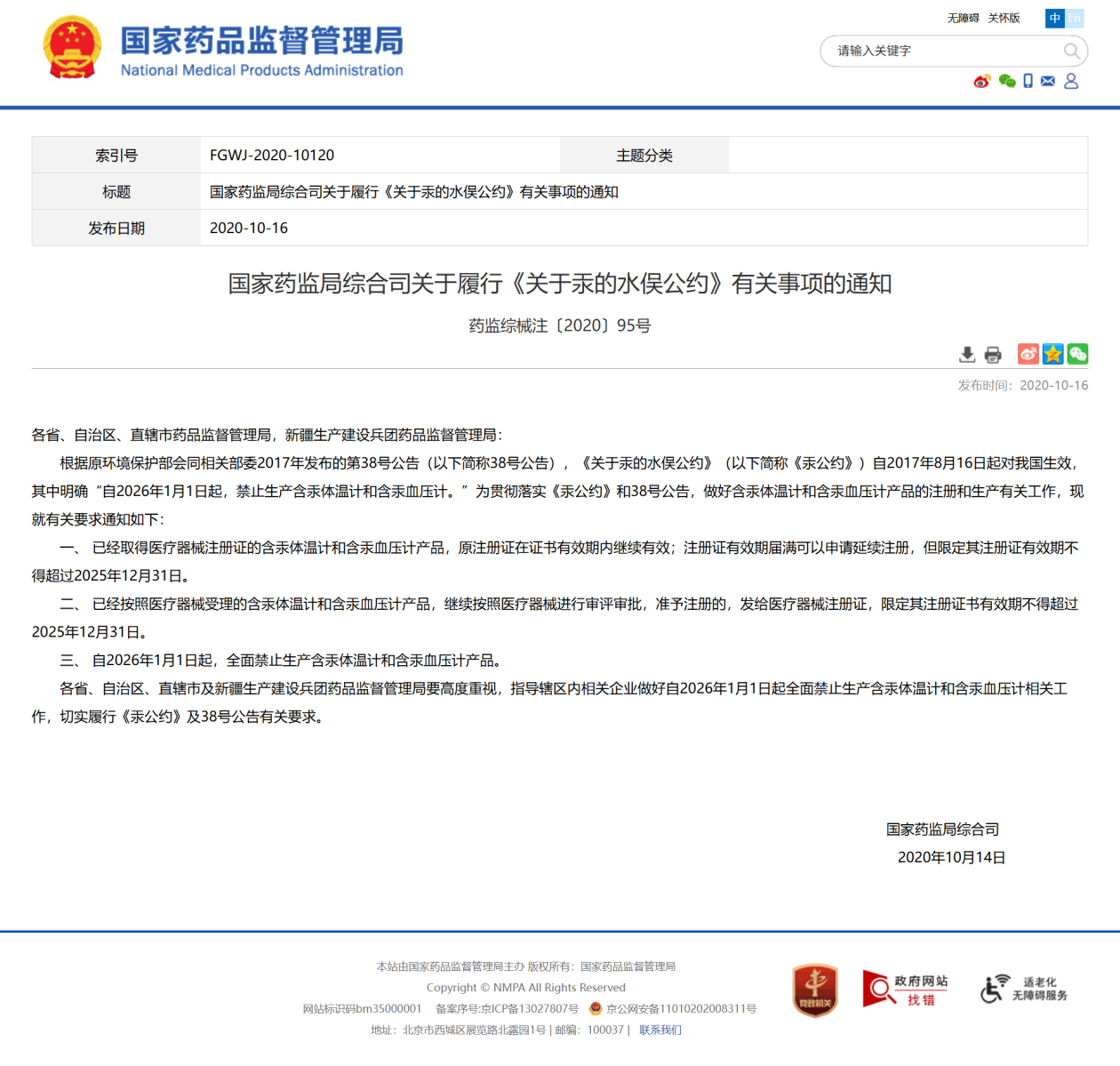 Core Points - From January 1, 2026, China will prohibit the production of mercury thermometers and blood pressure monitors, in compliance with the Minamata Convention on Mercury [1][2] - The National Medical Products Administration has set the registration certificate validity for mercury thermometers and blood pressure monitors to not exceed December 31, 2025 [1] - Mercury is a toxic and non-degradable metal that poses health risks and environmental hazards, particularly through the risk of mercury poisoning [1][2] Industry Impact - The ban on mercury-based medical devices aligns with international regulations and reflects a growing trend towards safer, non-toxic alternatives in the healthcare industry [1][2] - Current market alternatives include electronic thermometers, ear thermometers, and forehead thermometers, which are capable of meeting daily needs without the risks associated with mercury [2] - Electronic blood pressure monitors are favored for their ease of use, portability, clear digital display, and high safety, making them suitable for a wide range of users [2]