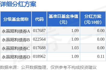 | 分级基金简称 | 代码 | 基准日基金净值 (元) | | 分红方案 (元/10份) | | | --- | --- | --- | --- | --- | --- | | 永赢昭利债券A 017687 | | | 1.09 | | 0.00 | | 永赢昭利债券B 022564 | | | 1.09 | | 0.00 | | 永赢昭利债券C 017688 | | | 1.03 | | 0.00 | | 永赢昭利债券D 018962 | | | 1.09 | | 0.11 | 证券之星消息,9月23日发布《永赢昭利债券型证券投资基金分红公告》。本次分红为本基金2025年度 的第2次分红。公告显示,本次分红的收益分配基准日为9月9日,详细分红方案如下: 本次分红对象为权益登记日在本基金管理人登记在册的本基金全体份额持有人。,权益登记日为9月23 日,现金红利发放日为9月24日。选择红利再投资的投资者,其红利将按照2025年09月23日除息后的基 金份额净值为计算基准确定再投资份额,并于2025年09月24日直接计入其基金账户,2025年09月25日起 投资者可以查询并在开放日赎回。根据相关法律法规的规定,基 ...