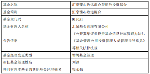 汇泉臻心致远混合A基金经理变动:增聘刘源为基金经理
