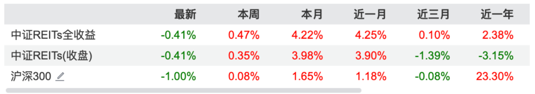 本周下跌的产品中,有6只产品跌幅超过2%。跌幅最大的是易方达广开产园REIT,单周跌幅为5.03%;华夏合肥高新REIT单周跌幅也超过3%。 【导读】本周公募REITs二级市场整体震荡上行,又有5只商业不动产REITs上报并获受理 本周公募REITs二级市场整体震荡上行,总体成交活跃度环比下降。 数据显示,本周(1月26日至1月30日)中证REITs全收益指数涨幅为0.47%,中证REITs指数上涨0.35%,跑赢沪深300指数。 | | 最新 | 本周 | 本月 | 近一月 | 近三月 | 近一年 | | --- | --- | --- | --- | --- | --- | --- | | 中证REITs全收益 | -0.41% | 0.47% | 4.22% | 4.25% | 0.10% | 2.38% | | 中证REITs(收盘) | -0.41% | 0.35% | 3.98% | 3.90% | -1.39% | -3.15% | | 沪深300 _ | -1.00% | 0.08% | 1.65% | 1.18% | -0.08% | 23.30% | 去年6月份起,在经历了一段时间震荡调整 ...
