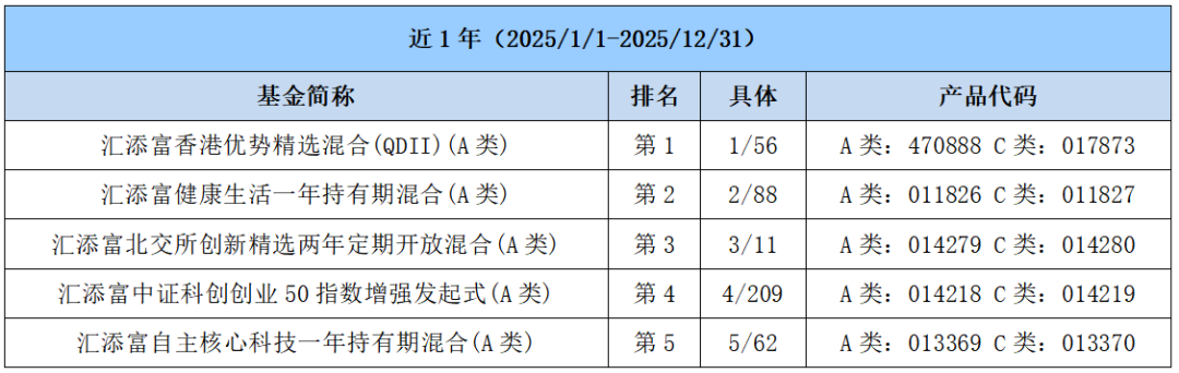 2025年,是主动权益投资的"回归之年"。随着经济逐步复苏、政策环境优化、市场情绪回暖,一批注重基本面研究、坚持长期主义的主动权益基金,凭借 扎实的投研底蕴和出色的选股能力,为投资者创造了亮眼的回报,再度彰显出其独特价值。 其中,素以"选股专家"著称的汇添富基金,在2025年以一份扎实的业绩答卷,清晰诠释了这一价值的含义。2025年,公司旗下汇添富香港优势精选A、汇 添富自主核心科技一年持有A分别以112.70%、102.40%的业绩实现年度收益率"破百"(同期业绩基准分别为27.63%、27.87%,业绩数据经托管行复核,基 准数据来自汇添富基金,统计区间为2025/1/1-2025/12/31),共有25只主动权益基金年度涨幅超过50%,多只基金业绩排名领先。 | 近1年(2025/1/1-2025/12/31) | | | | | --- | --- | --- | --- | | 基金简称 | 排名 | 具体 | 产品代码 | | 汇添富香港优势精选混合(QDII)(A类) | 第1 | 1/56 | A 类: 470888 C 类: 017873 | | 汇添富健康生活一年持有期混合(A类) | 第 ...