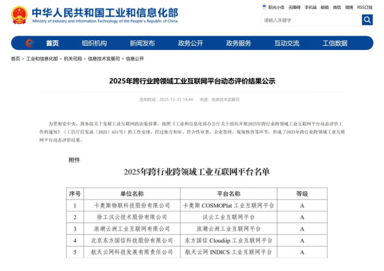 1月4日消息,工信部官网发布2025年跨行业跨领域工业互联网平台动态评价结果公示。 | 中华人民共和国工业和信息化部 | · 阳光小倍 无障碍 手机端 邮箱 微信 微博 RSS订阅 请输入关键字 | | --- | --- | | 20 | 首页 组织机构 新闻发布 政务公开 政务服务 互动交流 工信数据 | | 首页 > 工业和信息化部 > 机关司局 > 信息技术发展司 > 信息公开 | | | | 2025年跨行业跨领域工业互联网平台动态评价结果公示 | | | 发布时间:2025-12-31 14:44 来源:信息技术发展司 | | | 为贯彻党中央、国务院关于发展工业互联网的决策部署,按照《工业和信息化部办公厅关于组织开展2025年跨行业跨领域工业互联网平台动态评价工 作的感知》(工信厅信发函〔2025〕431.5》的工作安排,经过地方初审、符合性审查、企业答辩、现场被查等环节,形成了2025年跨行业跨领域工业互联 | | 现子以公示,请社会各界监督。 | 网平台动态评价结果。 | 为贯彻党中央、国务院关于发展工业互联网的决策部署,按照《工业和信息化部办公厅关于组织开展2025年跨行业跨领域工业互联网 ...