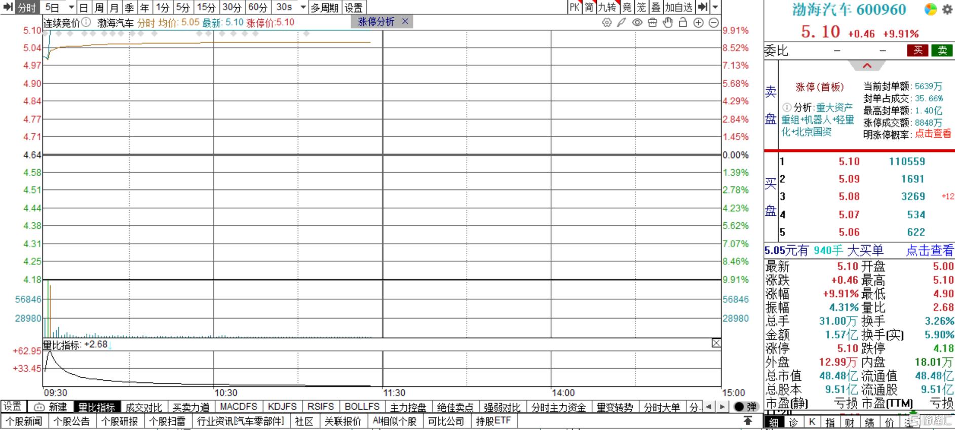 9月29日晚,渤海汽车发布公告称,公司拟以发行股份及支付现金的方式购买海纳川持有的北汽模塑51%股权、廊坊安道拓51%股权、智联科技100%股权和 廊坊莱尼线束50%股权,预计交易价格为27.28亿元。 同时,公司拟向不超过35名特定对象发行股份募集配套资金,总额不超过13.79亿元。 今日开盘后,渤海汽车涨停报5.10元/股,总市值48.48亿元。 | | | | > 分間 5日 ▼ 日 周 月 季 年 1分 5分 15分 30分 60分 30s ▼ 多周期 設置 | | | | | | | | | --- | --- | --- | --- | --- | --- | --- | --- | --- | --- | --- | | | | | 连续竞价 > | | | | 张停分析 × | | | | | 5.10 7 | � �� ��� | 0 � | | 00 0 0 0 0 0 | | 0 | | | | | | 5.04 | | | | | | | | | | | | 4.97 | | | | | | | | | | | | 4.90 | | | | | | | | | | | | 4.84 | ...