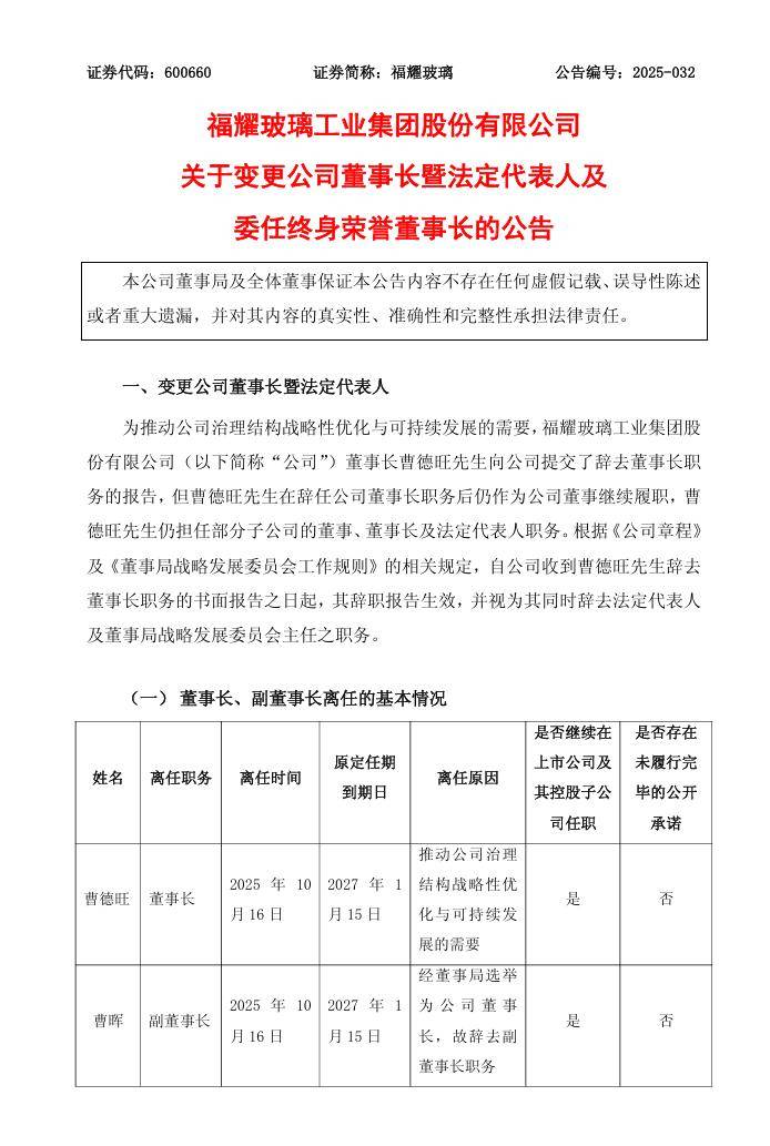 | | | | | | 是否继续在 | 是否存在 | | --- | --- | --- | --- | --- | --- | --- | | 姓名 | 离任职务 | 离任时间 | 原定任期 | 离任原因 | 上市公司及 | 未履行完 | | | | | 到期日 | | 其控股子公 | 毕的公开 | | | | | | | 司任职 | 承诺 | | 曹德旺 | 董事长 | 2025 年 10 月 16日 | 2027 年 1 月 15 日 | 推动公司治理 结构战略性优 化与可持续发 | 是 | 否 | | | | | | 展的需要 | | | | 曹晖 | 副董事长 | 2025 年 10 | 2027 年 1 | 经童事局选举 为公司董事 | 是 | 否 | | | | 月 16日 | 月 15 日 | 长,故辞去副 | | | | | | | | 黄事长职务 | | | IT之家 10 月 16 日消息,福耀玻璃工业集团股份有限公司今日公告,为推动公司治理结构战略性优化与可持续发展的需要,公司董事长曹德旺先生向公司提 交了辞去董事长职务的报告,但曹德旺先生在辞任公司董事长职务后仍作为公司董事继续履职, ...