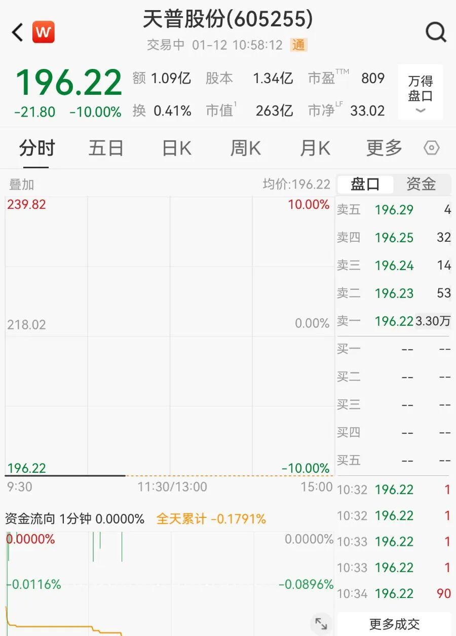 记者丨叶映橙 见习记者林健民 编辑丨周炎炎 1月12日,天普股份(605255.SH)复牌后"一字"跌停,报196.22元/股,总市值为263亿元。此前,该股在2025年下半 年表现活跃,年内大涨超16倍,居A股年度涨幅榜第二名,成为市场上的"明星股"。 | 五日 分时 | 日K | 月K | | | | --- | --- | --- | --- | --- | | 叠加 | | 均价:196.22 盘口 资金 | | | | 239.82 | | 10.00% 卖五 196.29 | | 4 | | | | 变型 196.25 | | 32 | | | | 》 | 196.24 | 14 | | | | 三二 | 196.23 | 53 | | 218.02 | | 0.00% 卖一 | 196.223.30万 | | | | | 25 = | | | | | | 25 T | | | | 196.22 | | 杀开 -10.00% | | | | 9:30 | 11:30/13:00 | 15:00 10:32 196.22 | | 7 | | | 资金流向 1分钟 0.0000% 全天累计 -0.17 ...