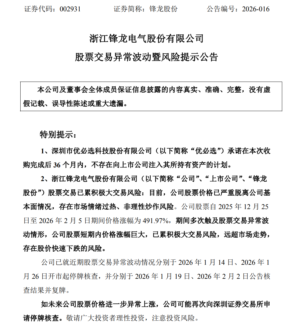 【导读】锋龙股份:如股票进一步异常上涨,可能再次申请停牌核查 中国基金报记者晨曦 超级牛股锋龙股份,再度发布停牌核查预警! 2月6日盘前,锋龙股份发布股票交易异常波动暨风险提示公告。锋龙股份称,如未来公司股票价格进一步异常上涨,公司可能再次向深圳证 券交易所申请停牌核查。敬请广大投资者理性投资,注意投资风险。 股价持续飙涨之际,锋龙股份已两度停牌核查,分别于1月19日,2月2日复牌。 值得关注的是,2月2日复牌后,锋龙股份终结此前多日连板行情,但仍连续4日拉出大阳线。据披露,锋龙股份2025年12月25日至2026年2月5 日期间,股价涨幅达491.97%。截至2月5日收盘,锋龙股份股价为116.5元/股,总市值为254.56亿元。 锋龙股份表示,公司股票短期内价格涨幅巨大,已累积极大交易风险,远超市场走势,存在股价快速下跌的风险。目前,公司股票价格已严 重脱离公司基本面情况,市盈率和市净率远超行业平均水平,存在市场情绪过热、非理性炒作风险。 此外,锋龙股份再次强调,深圳市优必选科技股份有限公司承诺在本次收购完成后36个月内,不存在向上市公司注入其所持有资产的计划。 截至目前,公司不涉及人形机器人业务,预计未 ...