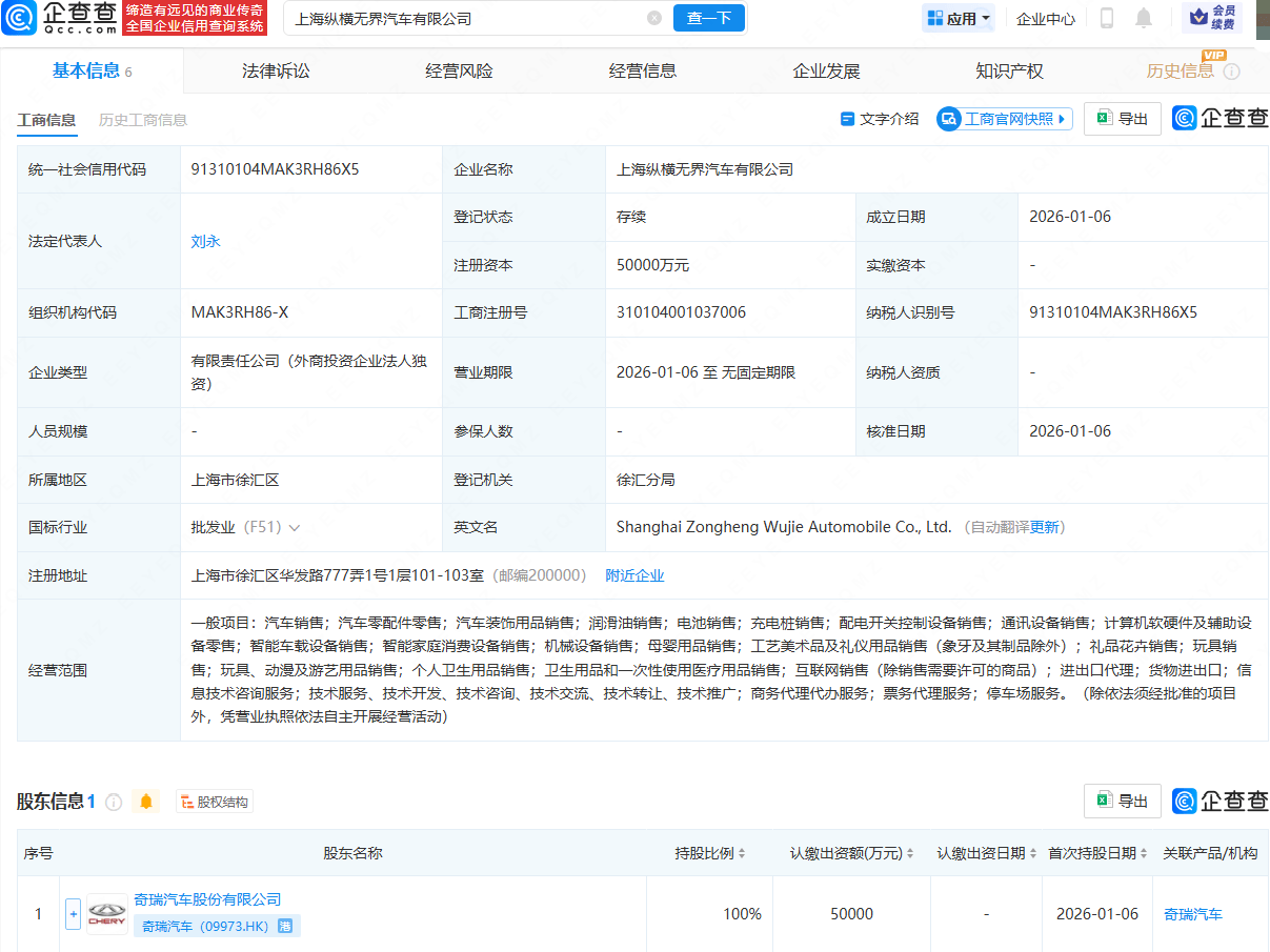 | 股东信息 1 ● | E= 股权结构 | | | | | 제 | | --- | --- | --- | --- | --- | --- | --- | | 序号 | | 股东名称 | 持股比例 ៖ | 认缴出资额(万元) ۾ | 认缴出资日期 ៖ 首次持股日期 ៖ | | | 2000 | 奇瑞汽车股份有限公司 奇瑞汽车(09973.HK) | | 100% | 50000 | | 2026-01-06 | | 企查看 缔造有远见的商业传奇 全国企业信用查询系统 | 上海纵横无界汽车有限公司 | | × 音一下 | ー 応用 ▼ | 企业中心 | | | --- | --- | --- | --- | --- | --- | --- | | 基本信息 6 | 法律诉讼 经营风险 | | 经营信息 | 企业发展 | 知识产权 | E | | 工商信息 历史工商信息 | | | | 目 文字介绍 | 【Ga 工商官网快照▶ 제 음出 | | | 统一社会信用代码 | 91310104MAK3RH86X5 | 企业名称 | 上海纵横无界汽车有限公司 | | | | | 法定代表人 | 刘永 | 登记状态 | ...