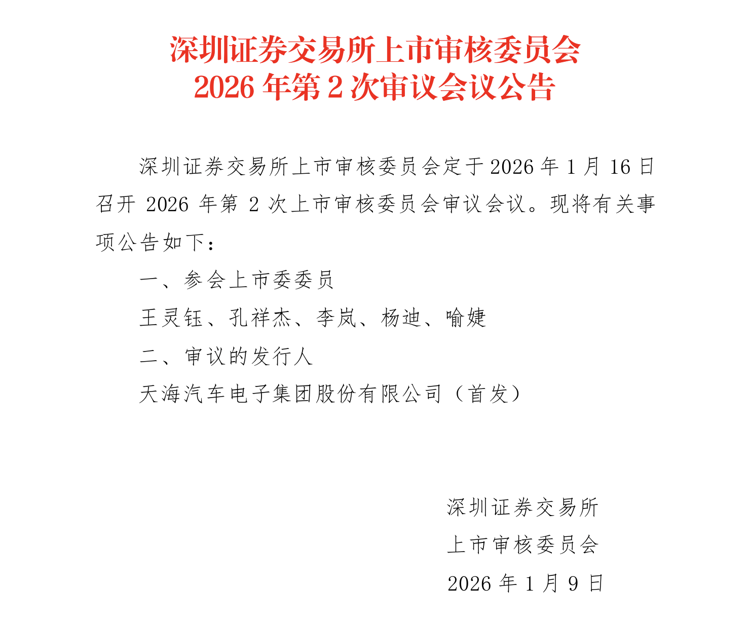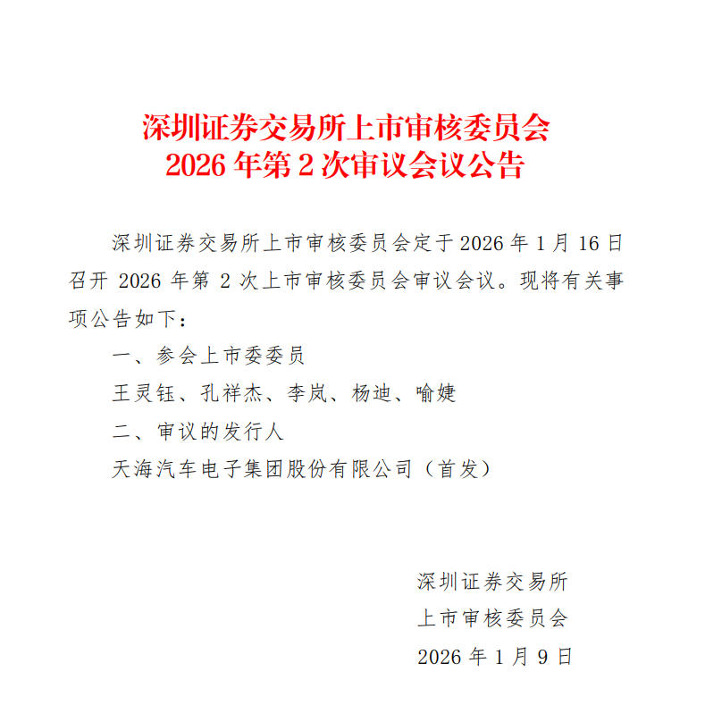 1月9日晚间,天海汽车电子集团股份有限公司发布深交所上市审核委员会2026年第2次审议会议公告,深圳证券交易所上市审核委员会定于1月16日召开2026 年第2次上市审核委员会审议会议,审核天海电子首发上会事项。 上证报中国证券网讯 1月9日晚间,天海汽车电子集团股份有限公司(简称"天海电子")发布深交所上市审核委员会2026年第2次审议会议公告,深圳证券交 易所上市审核委员会定于1月16日召开2026年第2次上市审核委员会审议会议,审核天海电子首发上会事项。 据更新后的招股说明书(申报稿),通过本次深交所主板IPO上市,公司将借力资本市场,拓宽融资渠道、加速技术迭代、完善产品矩阵,全力打造新质生 产力。在提升自身核心竞争力与市场影响力的同时,公司更希望以创新驱动产业升级,深度融入汽车产业变革,为中国汽车行业迈向全球价值链中高端、实 现高质量可持续发展注入强劲动能。 天海电子本次IPO募集资金将投向"连接器技改扩产建设项目""线束生产基地项目""汽车电子生产基地项目""智能改造及信息化建设项目"和"天海智能网联汽 车产业研究院及产业园配套项目",预计募集资金约24.6亿元。募投项目建设将进一步提升公司的研发能力 ...