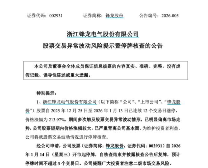 【导读】 13 连板锋龙股份明起停牌核查 中国基金报记者 忆山 1 月 13 日晚间, 13 连板的锋龙股份发布公告称,公司股票将于 1 月 14 日(星期三)开 市起停牌,预计停牌时间不超过 3 个交易日。 锋龙股份称,目前公司股价存在较高的炒作风险,未来存在快速下跌的风险。 截至 2026 年 1 月 13 日,公司收盘价为 61.79 元 / 股,静态市盈率为 2939.63 ,市净率 为 14.21 ;公司所属专用设备制造业静态市盈率为 42.34 ,市净率为 3.97 。公司的市盈率 和市净率与同行业的情况有较大差异。 股份转让交易尚存不确定性 股价短期涨幅严重背离公司基本面 去年 12 月 17 日,锋龙股份涨停,盘后发布的公告显示,公司正筹划控制权变更并将停牌, 直至 12 月 25 日复牌。 在最新公告中,锋龙股份表示, 2025 年 12 月 25 日至 2026 年 1 月 13 日,公司股票已 连续 12 个交易日涨停,价格涨幅为 213.97% ,在此期间多次触及股票交易异常波动情 形,已明显偏离市场走势。公司股票短期内价格涨幅较大,已严重背离公司基本面。 为维护投资者利益,公司将就股 ...