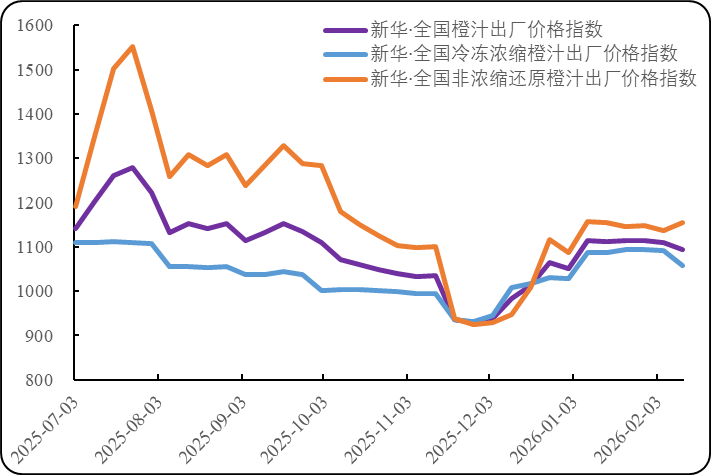 新华财经北京2月14日电(张保贺)欧盟鲜食甜橙减产且价格高企或将使得低价的橙汁消费增量,中国 传统春节假期临近带动终端市场鲜橙及橙汁消费增量。春节前夕,物流等交易成本上涨,使得全球冷冻 浓缩橙汁价格继续下滑且期现差基本归零,与终端消费直接关联的非浓缩还原橙汁出厂价出现小幅上 涨。截至2月12日,当周全球冷冻浓缩橙汁期货合约(FCOJ2603)结算均价为171.93美分/磅(折合 26.38元人民币/公斤),环比(2月5日,下同)下跌4.20%;新华·全国冷冻浓缩橙汁出厂价格指数报 1056.81点,环比下跌3.15%;新华·全国非浓缩还原橙汁出厂价格指数报1153.73点,环比上涨1.43%;新 华·全国橙汁出厂价格指数报1093.98点,环比下跌1.35%。 图1. 新华·全国橙汁出厂价格指数走势图(单位:点) 数据来源:新华指数研究院 备注:基于价格数据反映出市场规律,指数基期调整为2025年12月,基点1000点;结合美国农业部外国 农业服务局(USDA-FAS)报告中我国冷冻浓缩橙汁产量数据、国内行业机构测算的非浓缩还原橙汁产 量数据,以14:3的比重统一折算为所需加工果数量,权重固定为61.65%: ...