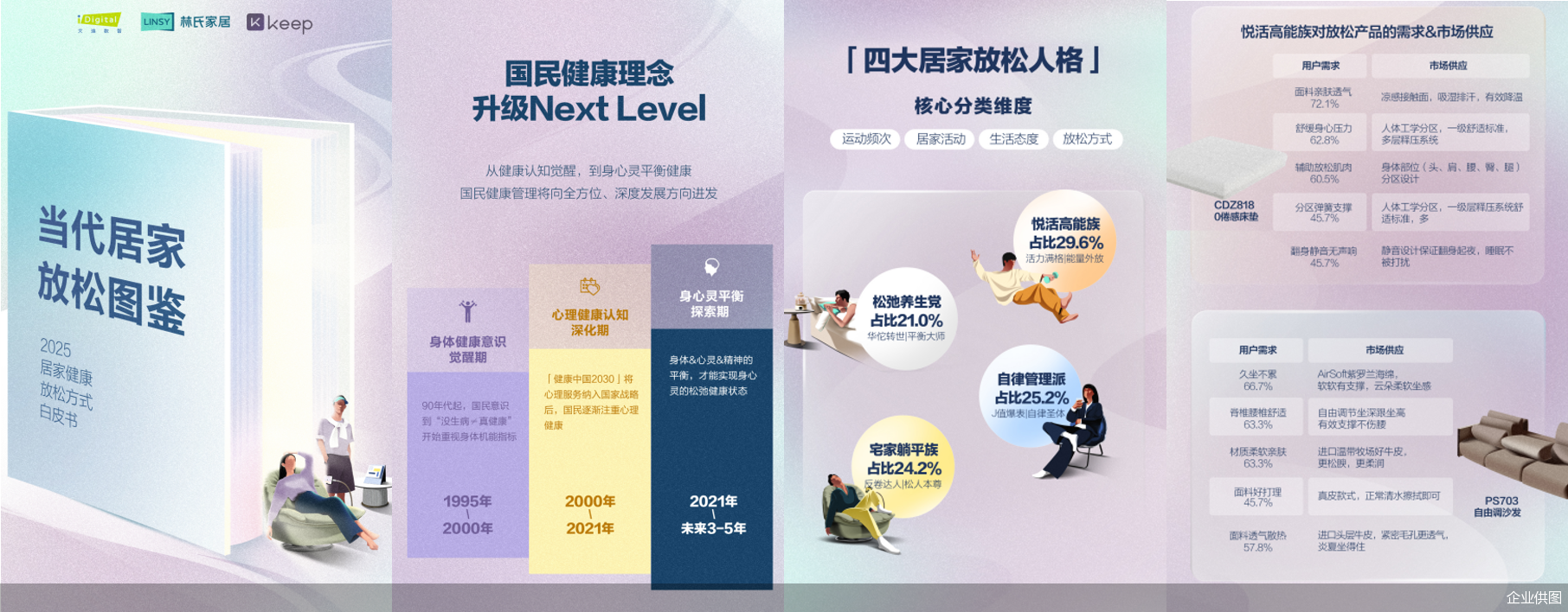 3月26日,林氏家居在佛山南海举办了"品质生活从家开始"品质季主题沙龙。本次沙龙上,林氏家居联合运动科技平台Keep以及研究机构艾瑞咨询,发布 《居家健康放松方式研究白皮书》(以下简称"白皮书")。随后,林氏家居还联合Keep在线上发起"RBTI放松人格测试",旨在引起更多人探讨和关注居家 健康。 这是行业内首次将"居家放松"上升至健康管理战略高度,并系统性提出了居家场景的健康放松解决方案。白皮书既为行业提供了关于居家健康管理的全新视 角。又将品质生活作为核心理念,探讨如何通过家居空间的升级,为现代人提供身心灵全面放松的综合能量补给站。随着国家健康战略的深化与年轻人 对"松弛感"的追求,林氏家居正以创新姿态引领家居行业向打造品质生活方向升级,为消费者带来全新的生活方式体验。 精准洞察消费新趋势 引领品质生活方式变革 如今,品质生活已成为大众的核心追求。从今年315晚会曝光多个行业的品质问题,强调维护消费者权益和提高产品质量的重要性,到国家战略层面不断强调 提升生活品质,如2025年全国两会期间,居住品质和新质生产力赋能高品质生活成为贯穿会议的热门议题,可见品质生活理念正在贯穿消费市场各个领域。 在家居行业,消 ...