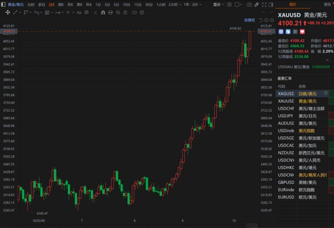 10月13日晚,现货黄金日内涨2.2%向上触及4100美元/盎司,再创历史新高。今年以来,现货黄金累计涨1475美元/盎司,累计涨幅达56%。截至发稿,现 货白银涨3.34%,报51.93美元/盎司;沪金期货主力连续合约涨2.28%,报935元(人民币)/克。 (智通财经) ...