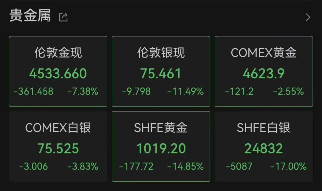 刚刚,国内商品期货市场开盘后,主力合约多数下跌,其中贵金属、有色金属板块大幅下挫! 继沪银上周五夜盘跌停后,今日铂、钯、锡也纷纷跌停。 | 代码 | 名称 | 现价 | 涨幅(结)↑ | 淵珠 | 淵速 | 买价 | 卖价 | | --- | --- | --- | --- | --- | --- | --- | --- | | ag2604 | 沪银2604 | 24832 | -17.00% | -5087 | 0.00 | | 24832 | | pd2606 | 舞2606 | 413.70 | -16.00% | -78.80 | 0.00 | | 413.70 | | pt2606 | 铂2606 | 552.15 | -16.00% | -105.15 | 0.00 | | 552.15 | | au2604 | 沪金2604 | 1060.38 | -11.41% | -136.54 | 0.46 | 1060.06 | 1060.40 | | sn2603 | 沪锡2603 | 392650 | -11.00% | -48530 | 0.00 | | 392650 | | cu2603 | ...