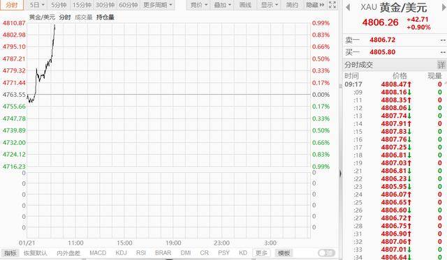 现货黄金升破4800美元/盎司 沪金期货涨超3%