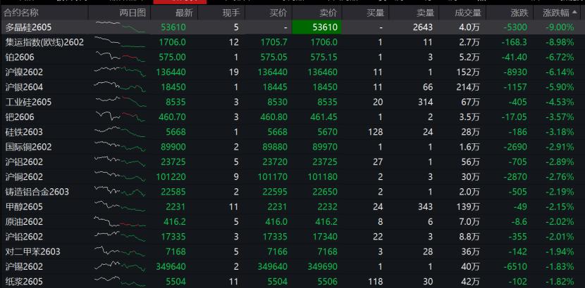 有色和贵金属板块出现明显回调迹象。 截至1月8日白天收盘,沪镍2602合约收跌6.14%,前一交易日该合约曾触及涨停板;同样在前一天收涨,沪银期货也 收跌近6%;国际铜、沪铝、沪铜、铸造铝合金、沪铅等期货主力合约均跌超2%;沪锡、氧化铝、沪锌、沪金等同样 收跌。 | 合约名称 | 两日图 | 最新 | 现手 | 买价 | 卖价 | 买属 | 22 1 | 成交量 | 涨跌 | 涨跌幅 4 | | --- | --- | --- | --- | --- | --- | --- | --- | --- | --- | --- | | 多昌硅2605 | | 53610 | 2 | | 53610 | | 2643 | 4.0万 | -5300 | -9.00% | | 集运指数(欧线)2602 | | 1706.0 | 12 | 1705.7 | 1706.0 | | 11 | 2.7万 | -168.3 | -8.98% | | H2606 | m | 575.00 | 1 | 575.05 | 575.15 | | 3 | 5.2万 | -41.40 | -6.72% | | 治道2602 | mana | ...