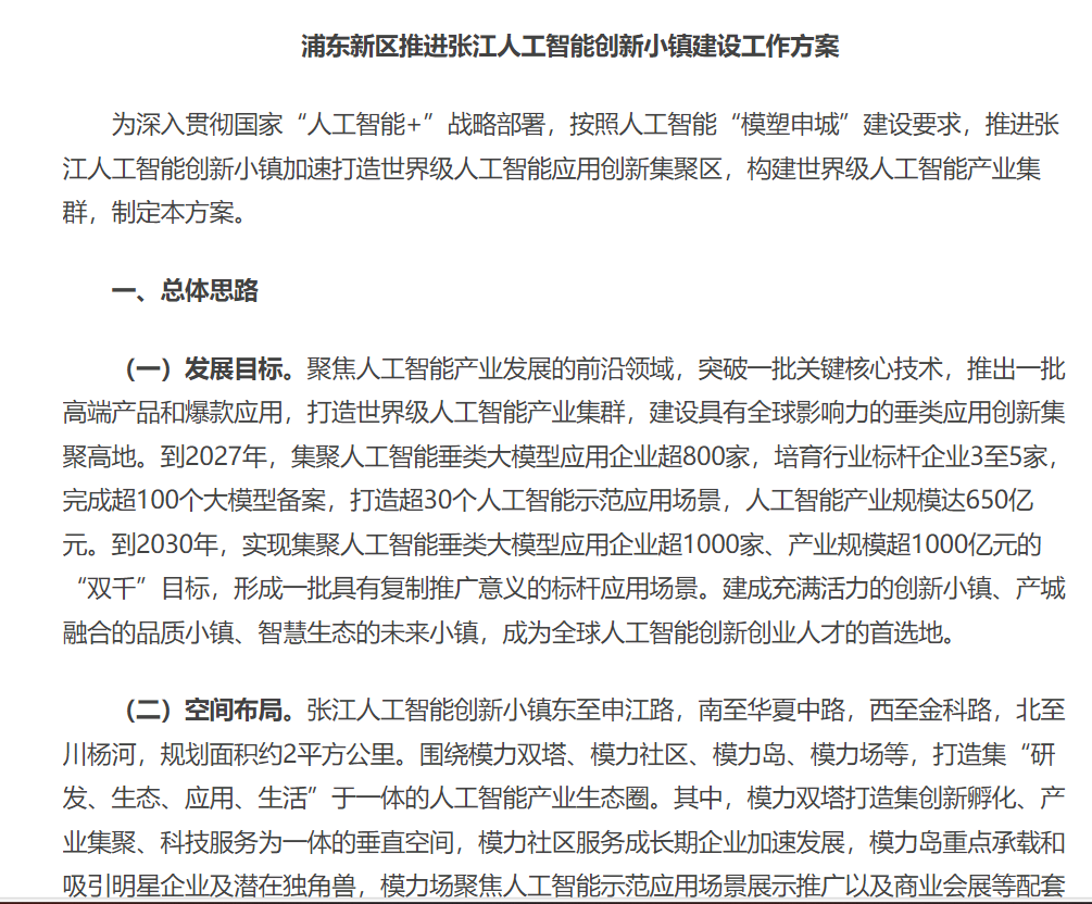 上海浦东持续加码AI投资布局! 1月20日,上海浦东正式发布《浦东新区推进张江人工智能创新小镇建设工作方案》(以下简称《建设方案》)。根据《建设方案》,浦东将 推进张江人工智能创新小镇加速打造世界级人工智能产业集群,建设具有全球影响力的垂类应用创新集聚高地。 张江人工智能创新小镇位于张江科学城核心区域,规划面积约2平方公里,围绕模力双塔、模力社区、模力岛、模力场等,打造集"研发、生 态、应用、生活"于一体的人工智能产业生态圈。其中,模力双塔打造集创新孵化、产业集聚、科技服务为一体的垂直空间,模力社区服务成 长期企业加速发展,模力岛重点承载和吸引明星企业及潜在独角兽,模力场聚焦人工智能示范应用场景展示推广以及商业会展等配套服务。 《建设方案》透露,到2027年,张江人工智能创新小镇将集聚人工智能垂类大模型应用企业超800家,培育行业标杆企业3至5家,完成超100个 大模型备案,打造超30个人工智能示范应用场景,人工智能产业规模达650亿元。到2030年,实现集聚人工智能垂类大模型应用企业超1000 家、产业规模超1000亿元的"双千"目标,形成一批具有复制推广意义的标杆应用场景。建成充满活力的创新小镇、产城融合 ...