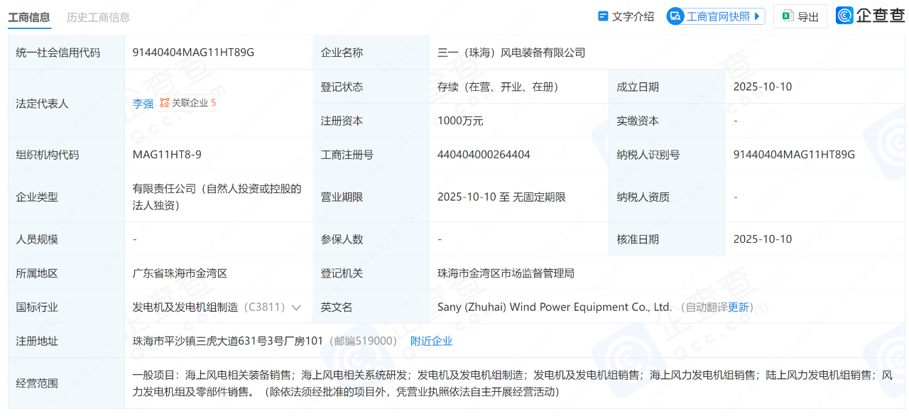 | 工商信息 历史工商信息 | | | | 目 文字介绍 | La L商官网快照▶ | | --- | --- | --- | --- | --- | --- | | 统一社会信用代码 | 91440404MAG11HT89G | 企业名称 | 三一(珠海)风电装备有限公司 | | | | 法定代表人 | 李强 8 关联企业 5 | 登记状态 | 存续(在营、开业、在册) | 成立日期 | 2025-10- | | | | 注册资本 | 1000万元 | 实缴资本 | | | 组织机构代码 | MAG11HT8-9 | 工商注册号 | 440404000264404 | 纳税人识别号 | 91440404 | | 企业类型 | 有限责任公司(自然人投资或控股的 法人独资) | 营业期限 | 2025-10-10 至 无固定期限 | 纳税人资质 | | | 人员规模 | | 参保人数 | | 核准日期 | 2025-10- | | 所属地区 | 广东省珠海市金湾区 | 登记机关 | 珠海市金湾区市场监督管理局 | | | | 国标行业 | 发电机及发电机组制造 (C3811) v | 英文名 | Sany (Z ...