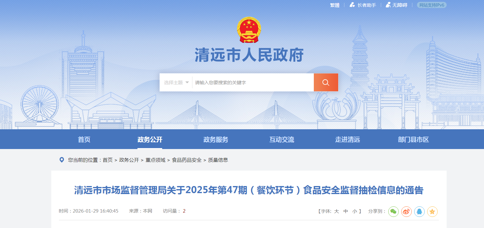 广东省清远市市场监督管理局关于2025年第47期(餐饮环节)食品安全监督抽检信息的通告