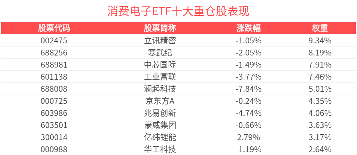数据显示,截至2025年10月31日,中证消费电子主题指数(931494)前十大权重股分别为立讯精密 (002475)、寒武纪(688256)、工业富联(601138)、中芯国际(688981)、澜起科技(688008)、京东方 A(000725)、兆易创新(603986)、豪威集团(603501)、亿纬锂能(300014)、东山精密(002384),前十大权 重股合计占比56.3%。 消费电子ETF(561600),场外联接(平安中证消费电子主题ETF发起式联接A:015894;平安中证消费电 子主题ETF发起式联接C:015895;平安中证消费电子主题ETF发起式联接E:024557)。 数据来源:wind 风险提示:基金有风险,投资需谨慎。基金管理人承诺以诚实信用、勤勉尽责的原则管理和运用基金资 产,但不保证本基金一定盈利,也不保证最低收益。基金管理人提醒投资人基金投资的"买者自负"原 则,在做出投资决策后,基金运营状况与基金净值变化引致的投资风险,由投资人自行负担。基金的过 往业绩及其净值高低并不预示其未来业绩表现,基金管理人管理的其他基金的业绩不构成对本基金业绩 表现的保证。投资人购买基金,既可能按 ...