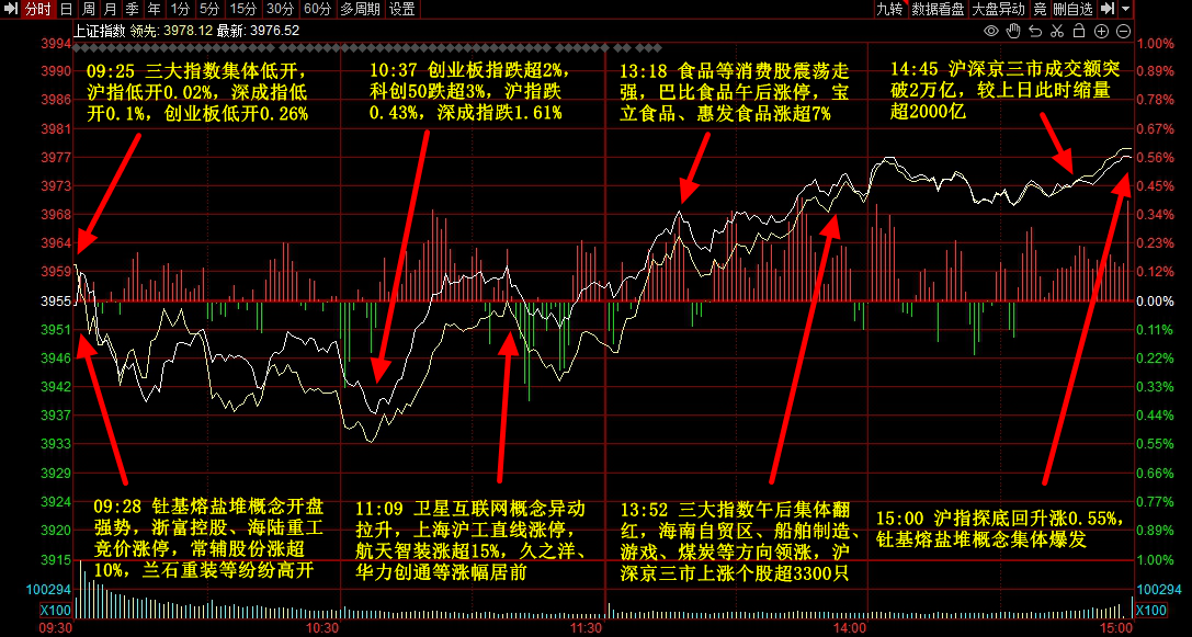 沪指翻红。 A股市场今天(11月3日)上午整体低位震荡,临近上午收盘,上证指数成功翻红。 概念板块方面,煤炭股今天上午大幅上涨,成为A股市场和港股市场主要亮点之一,其中港股飞尚无烟煤领涨,盘中涨幅一度超过180%。此外,核能核 电概念表现强势,多股开盘即涨停,消息面上,我国核能科技领域取得新突破。 沪指翻红 | 内地综合屏 | | 板块跟踪 | | 市场情绪 | 个股热图 | 综合排名 | 北向交易 热门股票 | | 资金流向 形态设 | | --- | --- | --- | --- | --- | --- | --- | --- | --- | --- | | 全A | | 涨 2674 | | 平 174 | | 跌 2590 | A股成交额 | 1.40万亿 | み | | 序号 | 代码 | | 名称 | | | 现价 | 涨跌 | 涨跌幅 | 成交额 | | 1 | 000001 | | 上证指数 | | | 3956.72 | 1.93 | 0.05% | 6194亿 | | 2 | 399001 | | 深证成指 | | | 13237.03 | -141.18 | -1.06% | 7618 ...