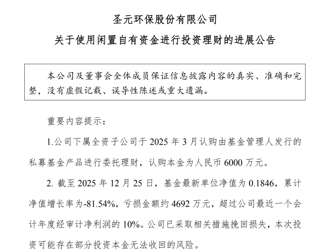 12月26日,圣元环保发布公告称,公司下属全资子公司于2025年3月认购由基金管理人发行的私募基金 产品进行委托理财,认购本金为人民币6000万元。 然而,截至2025年12月25日,上述基金最新单位净值为0.1846,累计净值增长率为-81.54%,亏损金额 约4692万元。 长江商报记者发现,2025年12月4日至2025年12月11日,圣元环保所购私募基金净值在短短7天里"缩 水"约72%。 圣元环保表示,公司已采取相关措施挽回损失,本次投资可能存在部分投资本金无法收回的风险。公司 同时向公安机关报警并已被受理,同时向中国证监会深圳监管局举报并收到材料接收证明。 长江商报消息 ●长江商报记者 黄聪 本想靠购买私募基金理财获得利润,没想到亏得血本无归,圣元环保(300867.SZ)遇到了"糟心事"。 基金累计净值增长率为-81.54% 12月26日,圣元环保发布公告称,公司下属全资子公司于2025年3月认购由基金管理人发行的私募基金 产品进行委托理财,认购本金为人民币6000万元。 截至2025年12月25日,基金最新单位净值为0.1846,累计净值增长率为-81.54%,亏损金额约4692万 元,超过圣 ...