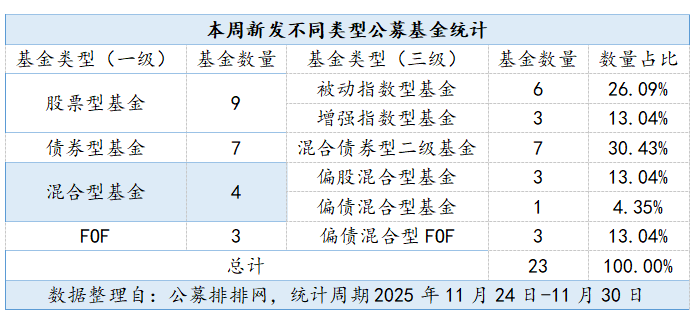 11月24日,记者从公募排排网获悉,本周(11月24日至11月30日)全市场共有23只新基金启动募 集,平均认购天数为23.65天。与前一周相比,新基金发行数量环比下降32.35%,平均认购天数延长超3 天,呈现"数量减少、募集期拉长"的趋势。 债券型基金发行则呈现逆势回暖态势,"股债跷跷板"效应再度凸显。本周共有7只债券型新基金进 入募集期,数量与前一周持平,并维持在近11周以来的峰值。 FOF(基金中的基金)基金成为发行市场的"稳定器",其活跃度未受权益市场波动影响。本周有3 只FOF新基金启动发行,为连续第8周有新基金面市,且连续第4周发行数量不低于3只。值得关注的 是,今年以来新发FOF基金数量已达76只,超过去年全年发行量的两倍。 "近期基金发行市场的降温,主要受权益市场表现疲软的拖累。作为市场主力的权益类基金,其发 行热度与A股走势高度相关。"排排网集团旗下融智投资FOF基金经理李春瑜向记者表示。 在李春瑜看来,近期市场持续震荡,削弱了投资者的风险偏好,导致对权益资产的认购热情显著降 温,新基金募集难度随之增加。此外,市场波动也使基金赚钱效应减弱,进一步加剧了投资者的观望情 绪,不仅新资金入场迟疑 ...