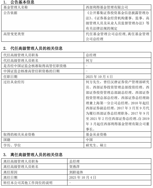 | | 西部利得基金管理有限公司基金行业 | | | | --- | --- | --- | --- | | | 高级管理人员变更公告 全体调用日期:2025年10月10日 | 付非从通知时 | 0.6. 2017年0 H.F. 3017 010 1 0 2 1 (Tim | | 1. 公告未本信 | | | BOOK, ILONG I DOLCE I FOLD | | | 基金目理人类的 ACHANGER FRANCE | | 理有限公司意事长。 | | | (公开展第正的歌员都会有剧剧剧演演出演》,但 | 取得的相关从业资格 | 高管从业前往 | | | 公告表现 2000 000 000 000 000 000 000 000 0 | A R | 中国 | | | | 新资理力进)等有关注律法规则成功 孕既,学位 | 研究生,硕士 | | | 代任基金管理公司已经建,面任高全管理公司负担 高所变更发情! | 文属生有效管家人员的相关信息 | | | | | 221-4-5620 COVER A. 814 | OFF | | | 2 代任高版管理人员的相关值值 | 图片品图面图人 图语名 | 8554 | ...