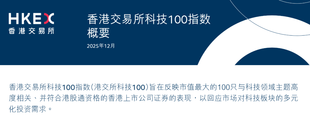 12月9日,香港交易及结算所有限公司(以下简称"港交所")正式推出港交所首只港股指数——香港交易所科技100指数("港交所科技100指数")。港交所科技 100指数的推出是港交所指数业务进一步拓展,继续推动区内资本市场生态圈发展的一个重要里程碑。 | 推出日期 | 2025年12月9日 | | --- | --- | | 基目 | 2020年12月31日 | | 基值 | 10,000 | | 货币 | 港元 | | 调整周期 | 每半年(6月及12月) | | 权重再平衡周期 | 每季度(3月、6月、9月及12月) | 港交所科技100指数涵盖多个重塑港股市场格局的创新行业,凸显了香港市场在推动新兴产业发展方面的关键角色,可以为投资者提供一个有效且全面的 投资工具。 据港交所介绍,作为一个宽基股票指数,港交所科技100指数追踪了100家在香港交易所上市的市值最大科技公司的表现。这些公司行业涵盖六大创新主 题:人工智能、生物科技及制药、电动汽车及智能驾驶、资讯科技、互联网和机器人。 具体来看,港交所科技100指数有以下特点: 一是选股满足市场对科技板块的多元化投资需求。指数涵盖100只与科技领域主题高度相关并 ...