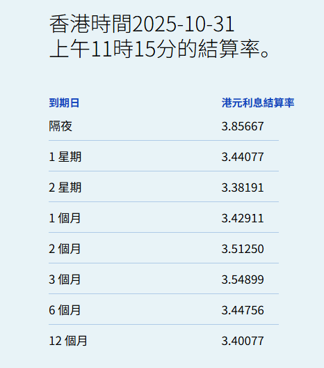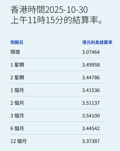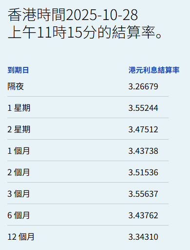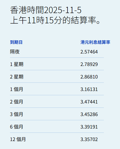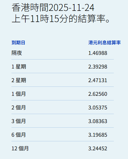 智通财经APP获悉,11月14日,港元拆息全线向下,隔夜息报2.08667%,跌44.881基点;一周拆息跌 8.661基点,报2.6447%,两周则跌3.143基点,报2.85976%。与楼按相关的一个月拆息连跌两日,报 3.06351%,跌3.405基点。 | 香港時間2025-11-14 | | --- | | 上午11時15分的結算率。 | | 到期日 | 港元利息結算率 | | --- | --- | | 隔夜 | 2.08667 | | 1 星期 | 2.64470 | | 2 星期 | 2.85976 | | 1 個月 | 3.06351 | | 2 個月 | 3.54738 | | 3 個月 | 3.46982 | | 6 個月 | 3.39167 | | 12 個月 | 3.38411 | 反映银行资金成本的三个月拆息报3.46982%,跌2.066基点。长息方面,六个月拆息跌1.637基点,报 3.39167%,一年期则跌0.071基点,报3.38411%。 ...