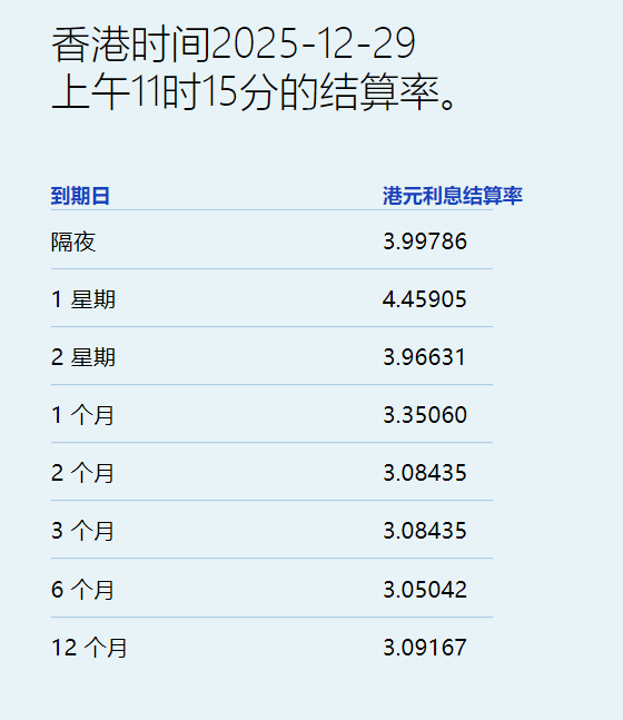 | 到期日 | 港元利息结算率 | | --- | --- | | 隔夜 | 3.99786 | | 1 星期 | 4.45905 | | 2 星期 | 3.96631 | | 1 个月 | 3.35060 | | 2 个月 | 3.08435 | | 3 个月 | 3.08435 | | 6 个月 | 3.05042 | | 12 个月 | 3.09167 | 智通财经APP获悉,香港银行同业拆息(HIBOR)长短期限利率走势不一。根据香港银行公会于12月29日 公布的数据,与楼按相关的一个月拆息连升两日报3.3506%,升6.149基点;反映银行资金成本的三个月 拆息报3.08435%,跌1.059基点。隔夜息报3.99786%,跌2.607基点;一周拆息升5.595基点,报 4.45905%,两周则升3.821基点,报3.96631%。长息方面,六个月拆息升1.328基点,报3.05042%,一年 期则跌0.035基点,报3.09167%。 ...