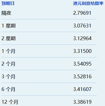 港元拆息全线向下 一个月拆息连跌两日报3.06351%