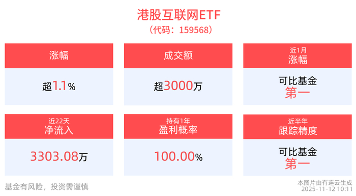 截至2025年11月12日 10:11,中证港股通互联网指数上涨0.58%,成分股平安好医生上涨5.81%,趣致集 团上涨5.04%,京东健康上涨4.80%,小米集团-W上涨3.07%,狮腾控股上涨3.00%。港股互联网 ETF(159568)上涨1.13%,最新价报1.87元。拉长时间看,截至2025年11月11日,港股互联网ETF近3月累 计上涨2.66%。 流动性方面,港股互联网ETF盘中换手10.23%,成交3881.56万元,市场交投活跃。拉长时间看,截至 11月11日,港股互联网ETF近1年日均成交2.21亿元。 截至2025年11月12日 10:11,恒生科技指数上涨0.59%,成分股京东健康上涨4.80%,小米集团-W上涨 3.07%,阿里健康上涨2.77%,舜宇光学科技上涨2.44%,携程集团-S上涨2.38%。恒生科技指数 ETF(159742)上涨0.73%,最新价报0.83元。拉长时间看,截至2025年11月11日,恒生科技指数ETF近3月 累计上涨9.93%。 流动性方面,恒生科技指数ETF盘中换手1.43%,成交6588.04万元。拉长时间看,截至11月11日,恒生 科技指数ETF ...