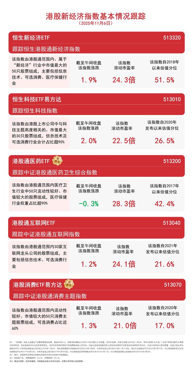 今日港股普遍走强,半导体、新能源车、互联网、新消费等方向表现强势,截至收盘,恒生科技指数上 涨2.0%,恒生港股通新经济指数上涨1.9%,中证港股通消费主题指数上涨1.3%,中证港股通互联网指 数上涨1.2%,中证港股通医药卫生综合指数下跌0.3%。 | 跟踪中证港股通消费主题指数 | | | | | --- | --- | --- | --- | | 该指数由港股通范围内流动性 | 截至午间收盘 | 该指数 | 该指数自2020年 | | 较好、市值较大的50只消费主 | 该指数涨跌 | 滚动市盈率 | 发布以来估值分位 | | 题股票组成,可选消费占比近 60% | 1.3% | 21.0倍 | 17.0% | 注! "铁座痴"作者上述基金产品具体明国的所数: 我提高日取+4),拆资流发现联冠2020年11月6日报立平成弦盘,流动希温率,益低分位版王均05年11月1日,双达希望率之尚值公汇近四个季度风易公司窗 系统净利润、铝体维持和企业发射紧密相关。适用于及利用对找农卫受闲用影响设小的行业。估值分直运国度领历史上深动市政策等手游官方向市场基审的利用占比。5体纷介绍民政府用户提篮。5位分位区风力 海藏波布日 ...
