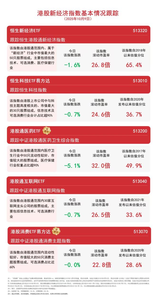 | | 恒生新经济ETF | | | 513320 | | | --- | --- | --- | --- | --- | --- | | | 跟踪恒生港股通新经济指数 | | | | | | | 该指数由港股通范围内、属于 "新经济"行业中市值最大的 | 交目 该指数涨跌 | 该指数 滚动市盈率 | 该指数自2018年 以来估值分位 | | | | 50只股票组成,主要包括信息 | | | | | | | 技术、可选消费、医疗保健行 | -1.6% | 26. 8倍 | 65. 4% | 415 | | | 恒生科技ETF易方达 | | | 513010 | | | | 跟踪恒生科技指数 | | | | | | | 该指数由港股上市公司中与科 | 令日 | 该指数 | 该指数自2020年 | | | | 技主题高度相关的、市值最大 | 该指数涨跌 | 滚动市盈率 | 发布以来估值分位 | | | | 的30只股票组成,信息技术及 | | | | | | | 可选消费行业合计占比超90% | -0. 7% | 24.6倍 | 36. 7% | | | | 港股通矢药ETF ( | | | 513200 | | ...